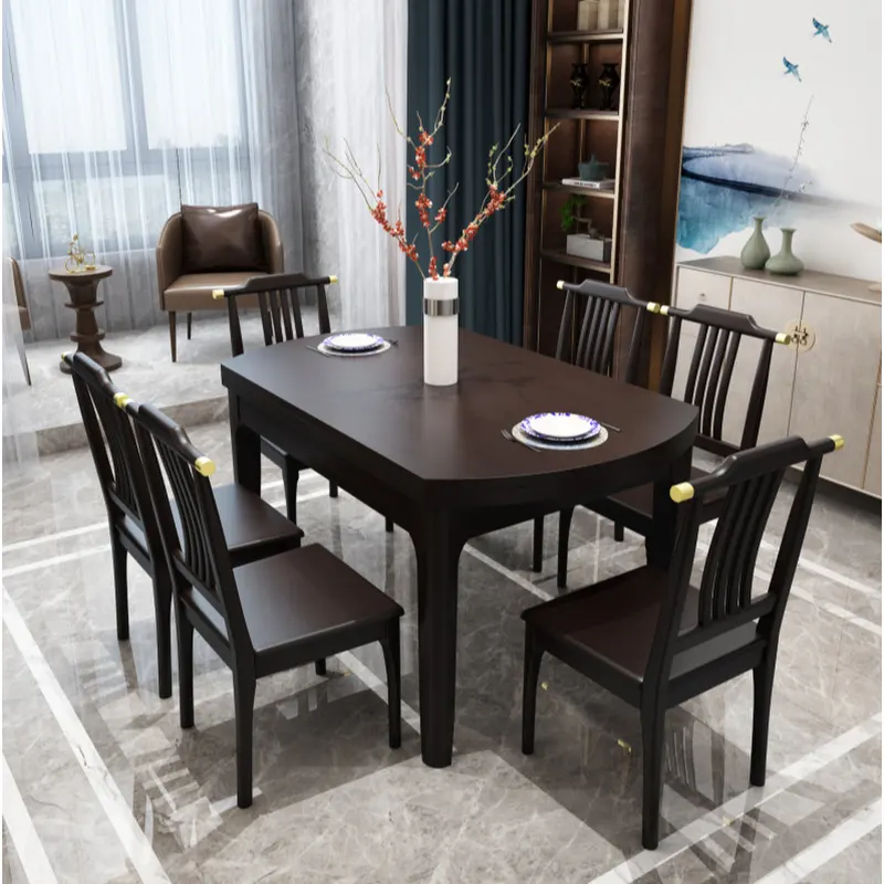 Elegant New Chinese Style Solid Wood Dining Table Set - Expandable Square Table with 6 Chairs, Minimalist Design for Modern Dining Spaces